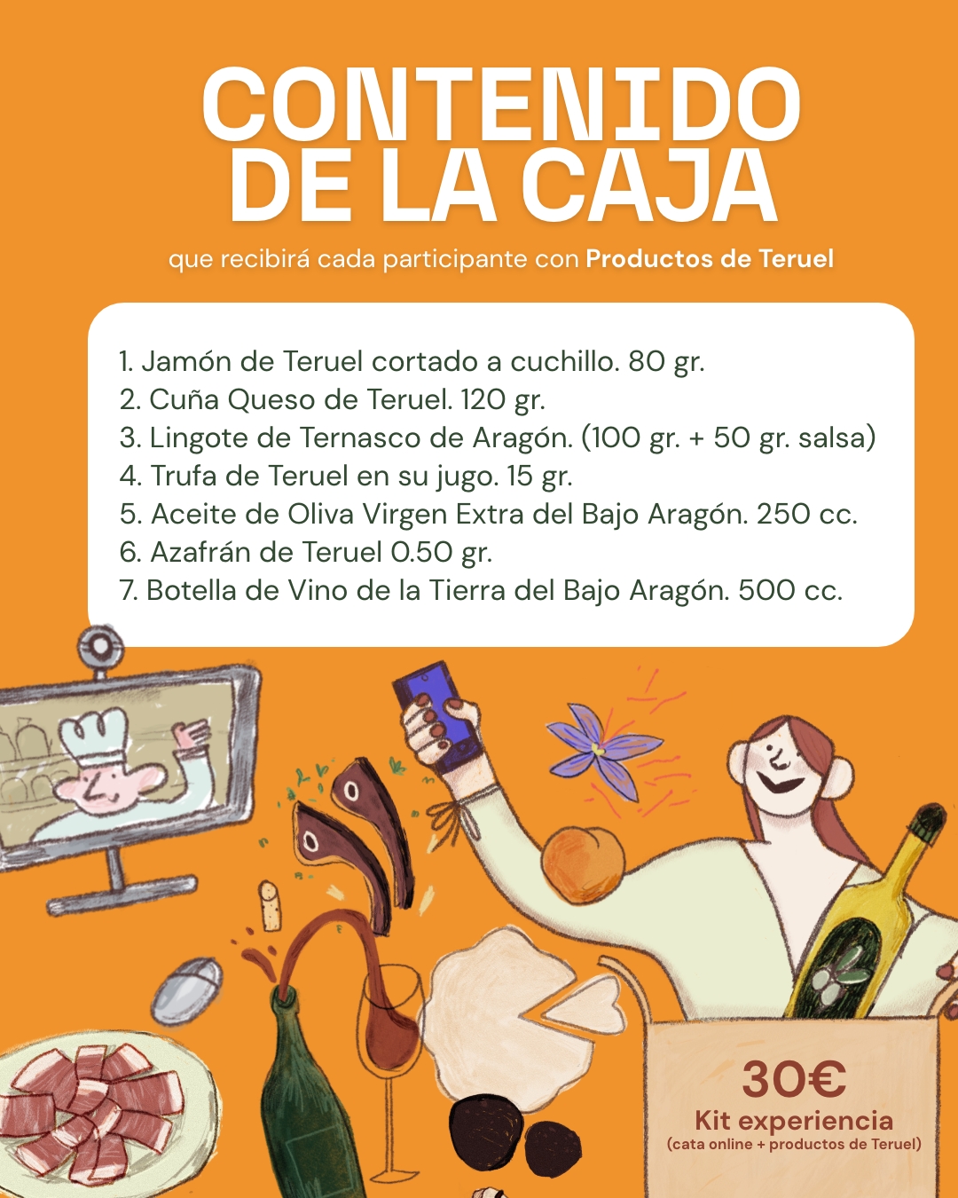 Todos ellos recibirán previamente a la cata, su caja con los siguientes productos de Teruel: 80 gr. de Jamón de Teruel cortado a cuchillo, 1 cuña de 120 gr. de Queso de Teruel artesano de oveja, un lingote de Ternasco de Aragón con su salsa precocinado, 15 gr. de Trufa Negra de Teruel en su jugo, 1 botella de Aceite de Oliva Virgen Extra del Bajo Aragón, medio gramo de Azafrán de Teruel y una botella de vino tinto IGP Bajo Aragón.